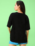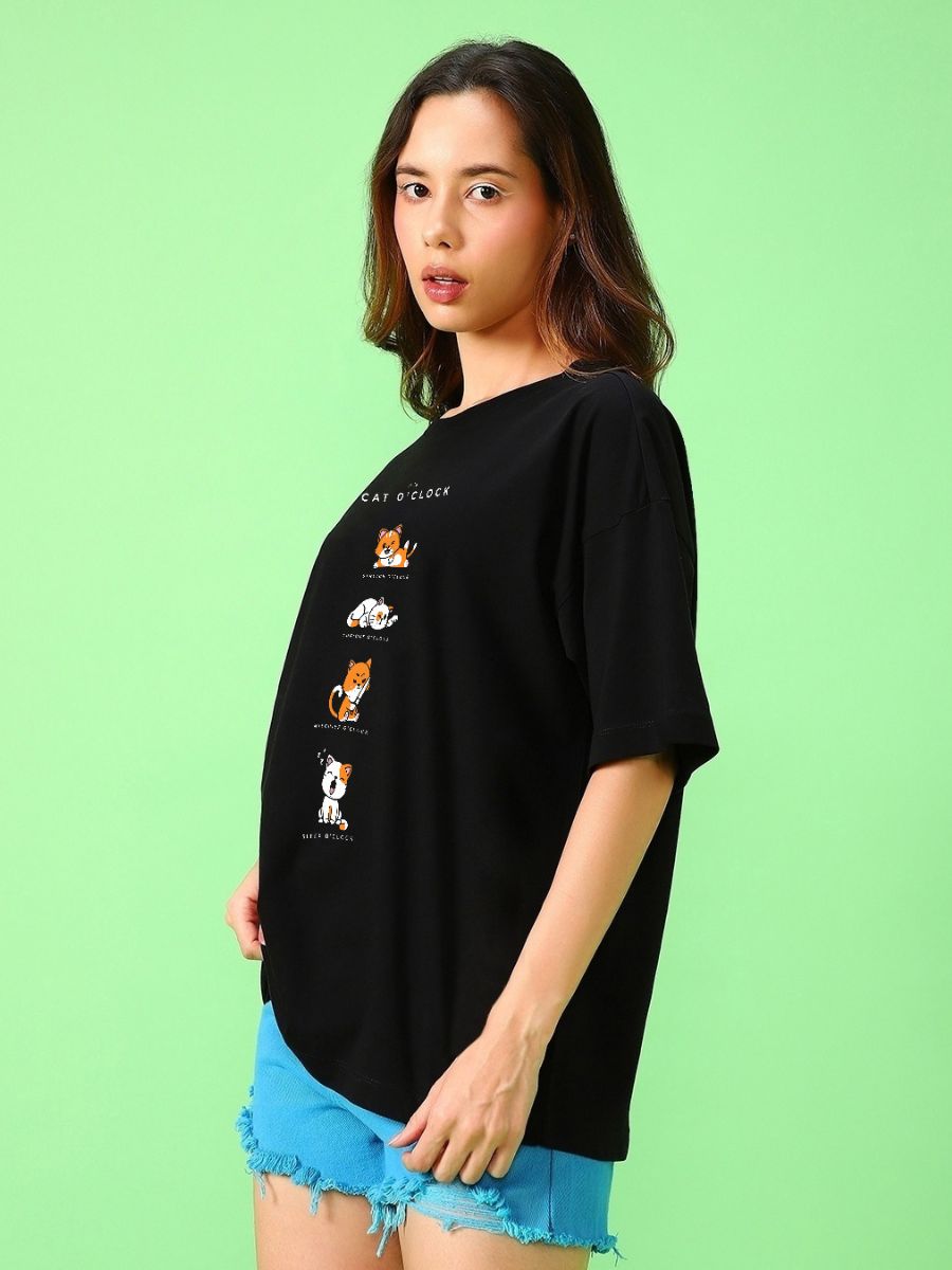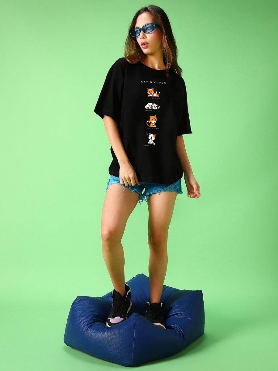 Women's Black Cat O'Clock Graphic Printed Oversized T-shirt